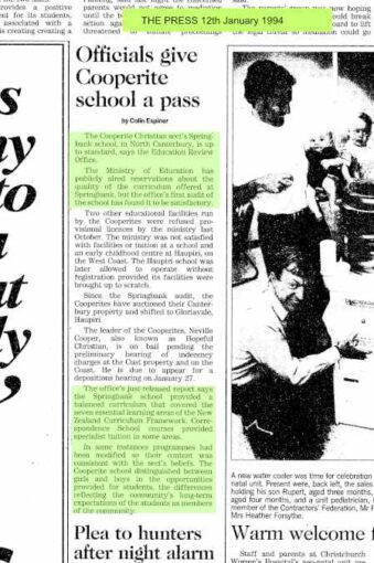 In January 1994 ERO completed a review of the Springbank school and somehow were satisfied that the community were teaching a balanced curriculum, although admitted that, “In some instances prograames had been modified so their content was consistent with the sect’s beliefs. The Cooperite school distinguished between girls and boys in the opportunities provided for students, the difference reflecting the community’s long-term expectations of the students as members of the community.” The school at the Springbank site shut soon after the property was auctioned and the school on the new Gloriavale site was allowed to continue without registration provided its facilities were brought up to scratch. Read the article here.