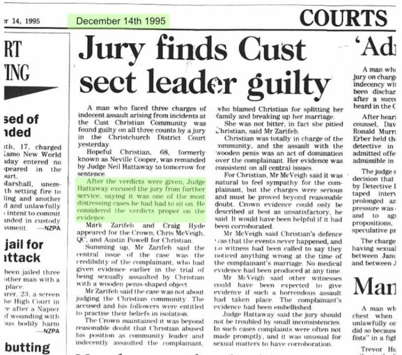 In June 1993 the Police began an investigation in Neville Cooper following allegations of sexual misconduct. Dawn raids were executed on July 20th 1993 at both the Springbank and Gloriavale properties, which resulted in the arrest of Neville Cooper.