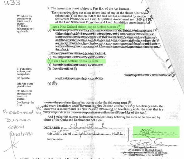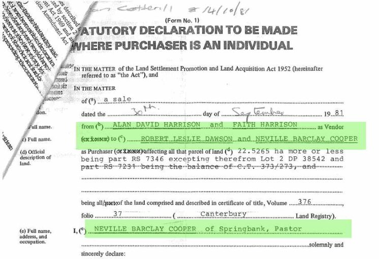 In 1989 the official purchase of the land was complete and the land transferred to the newly formed Trust. Interestingly, court records showed that the purchasers of the land were Neville Copper and Robert Dawson – both Australian immigrants were who legally not allowed to own land in New Zealand without Government approval. Perhaps this explains why on the sale and purchase document they both selected the option stating their status was “NZ Citizen by Birth”. This was patently untrue. This piece of evidence was traversed in detail during the 2022 Pilgrim Employment Court proceedings, where Faithful Pilgrim was taken through the document. He recognised this was not true, and affirmed that both Neville Cooper and Robert Dawson were Australian citizens. It is clear, that the original purchase of the land from Alan Harrison at Springbank was based on deceit. You can read the whole agreement here: